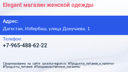 Elegant, магазин женской одежды по адресу Дагестан, Избербаш, улица Докучаева, 1 в дальнейшем Организация, размещена в следующих категориях:
