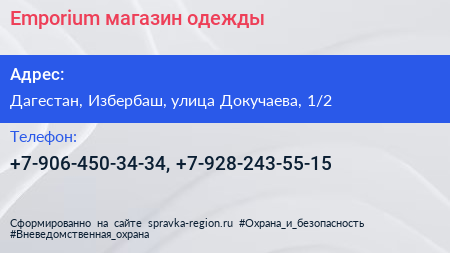 Emporium, магазин одежды по адресу Дагестан, Избербаш, улица Докучаева, 1/2 в дальнейшем Организация, размещена в следующих категориях: