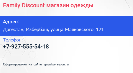 Family Discount, магазин одежды по адресу Дагестан, Избербаш, улица Маяковского, 121 в дальнейшем Организация, размещена в следующих категориях: