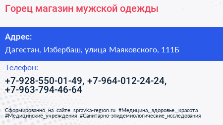 Горец, магазин мужской одежды по адресу Дагестан, Избербаш, улица Маяковского, 111Б в дальнейшем Организация, размещена в следующих категориях: