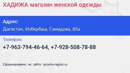 ХАДИЖА, магазин женской одежды по адресу Дагестан, Избербаш, Гамидова, 85а в дальнейшем Организация, размещена в следующих категориях: