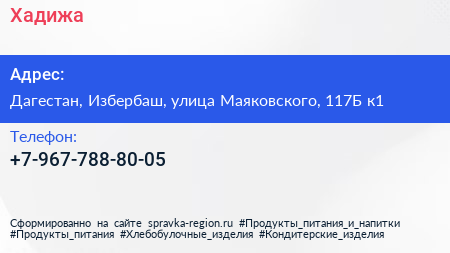 Хадижа по адресу Дагестан, Избербаш, улица Маяковского, 117Б к1 в дальнейшем Организация, размещена в следующих категориях: