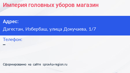 Империя головных уборов, магазин по адресу Дагестан, Избербаш, улица Докучаева, 1/7 в дальнейшем Организация, размещена в следующих категориях: