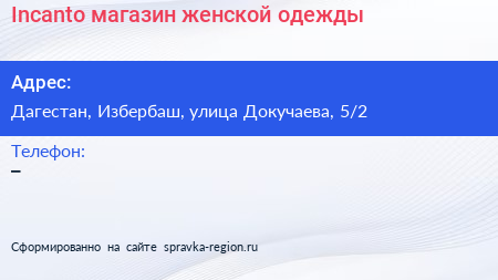 Incanto, магазин женской одежды по адресу Дагестан, Избербаш, улица Докучаева, 5/2 в дальнейшем Организация, размещена в следующих категориях: