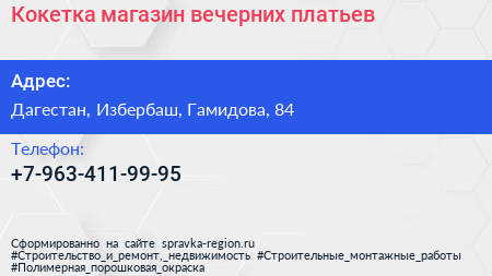 Кокетка, магазин вечерних платьев по адресу Дагестан, Избербаш, Гамидова, 84 в дальнейшем Организация, размещена в следующих категориях: