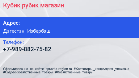Кубик рубик, магазин по адресу Дагестан, Избербаш, в дальнейшем Организация, размещена в следующих категориях: