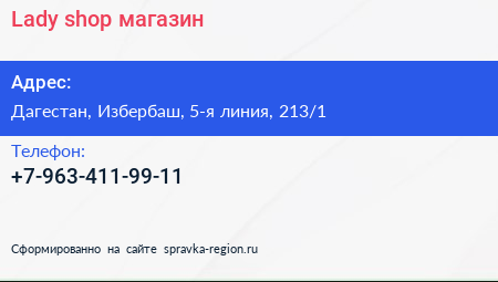 Lady shop, магазин по адресу Дагестан, Избербаш, 5-я линия, 213/1 в дальнейшем Организация, размещена в следующих категориях: