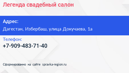 Легенда, свадебный салон по адресу Дагестан, Избербаш, улица Докучаева, 1а в дальнейшем Организация, размещена в следующих категориях: