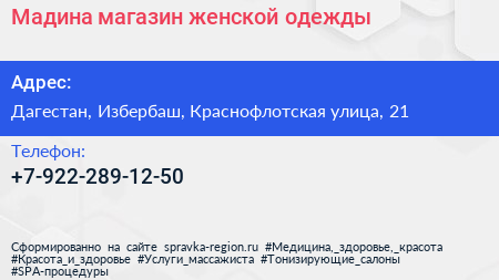 Мадина, магазин женской одежды по адресу Дагестан, Избербаш, Краснофлотская улица, 21 в дальнейшем Организация, размещена в следующих категориях: