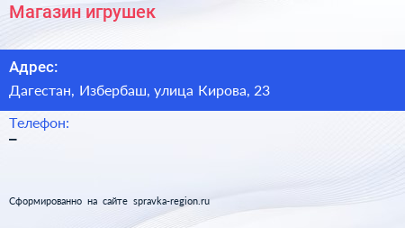 Магазин игрушек по адресу Дагестан, Избербаш, улица Кирова, 23 в дальнейшем Организация, размещена в следующих категориях: