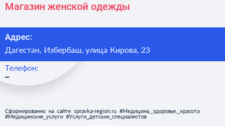 Магазин женской одежды по адресу Дагестан, Избербаш, улица Кирова, 23 в дальнейшем Организация, размещена в следующих категориях:
