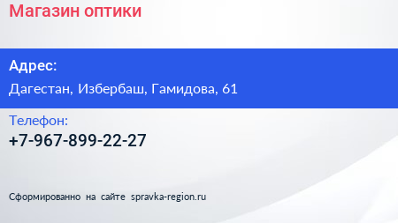 Магазин оптики по адресу Дагестан, Избербаш, Гамидова, 61 в дальнейшем Организация, размещена в следующих категориях: