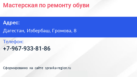 Мастерская по ремонту обуви по адресу Дагестан, Избербаш, Громова, 8 в дальнейшем Организация, размещена в следующих категориях: