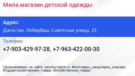 Мила, магазин детской одежды по адресу Дагестан, Избербаш, Советская улица, 21 в дальнейшем Организация, размещена в следующих категориях: