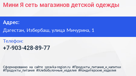 Мини-Я, сеть магазинов детской одежды по адресу Дагестан, Избербаш, улица Мичурина, 1 в дальнейшем Организация, размещена в следующих категориях: