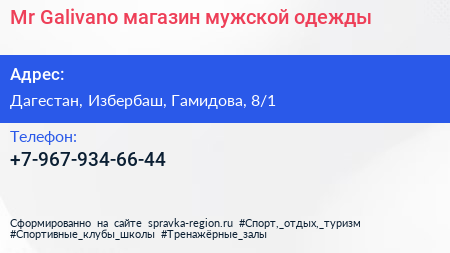 Mr. Galivano, магазин мужской одежды по адресу Дагестан, Избербаш, Гамидова, 8/1 в дальнейшем Организация, размещена в следующих категориях: