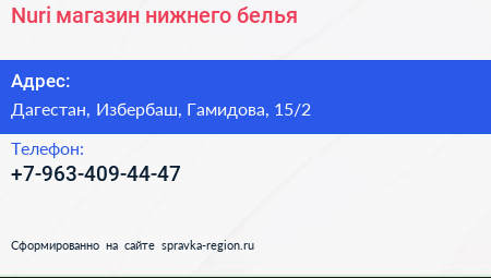 Nuri, магазин нижнего белья по адресу Дагестан, Избербаш, Гамидова, 15/2 в дальнейшем Организация, размещена в следующих категориях:
