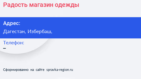 Радость, магазин одежды по адресу Дагестан, Избербаш, в дальнейшем Организация, размещена в следующих категориях:
