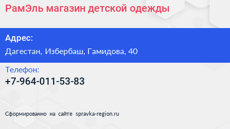 РамЭль, магазин детской одежды по адресу Дагестан, Избербаш, Гамидова, 40 в дальнейшем Организация, размещена в следующих категориях: