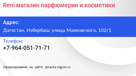 Reni, магазин парфюмерии и косметики по адресу Дагестан, Избербаш, улица Маяковского, 102/1 в дальнейшем Организация, размещена в следующих категориях: