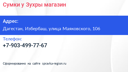 Сумки у Зухры, магазин по адресу Дагестан, Избербаш, улица Маяковского, 106 в дальнейшем Организация, размещена в следующих категориях: