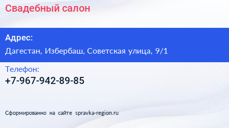 Свадебный салон по адресу Дагестан, Избербаш, Советская улица, 9/1 в дальнейшем Организация, размещена в следующих категориях: