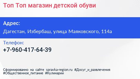 Топ-Топ, магазин детской обуви по адресу Дагестан, Избербаш, улица Маяковского, 114а в дальнейшем Организация, размещена в следующих категориях: