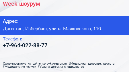 Week, шоурум по адресу Дагестан, Избербаш, улица Маяковского, 110 в дальнейшем Организация, размещена в следующих категориях:
