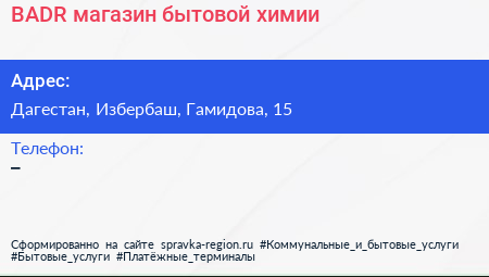 BADR, магазин бытовой химии по адресу Дагестан, Избербаш, Гамидова, 15 в дальнейшем Организация, размещена в следующих категориях:
