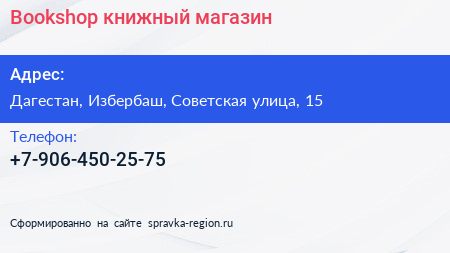 Bookshop, книжный магазин по адресу Дагестан, Избербаш, Советская улица, 15 в дальнейшем Организация, размещена в следующих категориях: