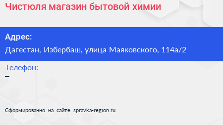 Чистюля, магазин бытовой химии по адресу Дагестан, Избербаш, улица Маяковского, 114а/2 в дальнейшем Организация, размещена в следующих категориях: