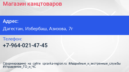 Магазин канцтоваров по адресу Дагестан, Избербаш, Азизова, 7г в дальнейшем Организация, размещена в следующих категориях: