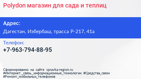 Polydon, магазин для сада и теплиц по адресу Дагестан, Избербаш, трасса Р-217, 41а в дальнейшем Организация, размещена в следующих категориях: