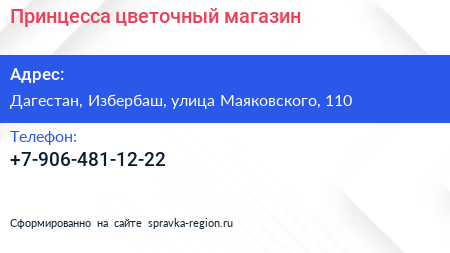 Принцесса, цветочный магазин по адресу Дагестан, Избербаш, улица Маяковского, 110 в дальнейшем Организация, размещена в следующих категориях: