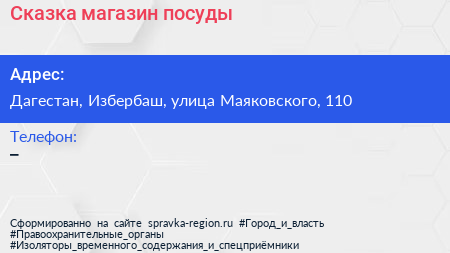 Сказка, магазин посуды по адресу Дагестан, Избербаш, улица Маяковского, 110 в дальнейшем Организация, размещена в следующих категориях: