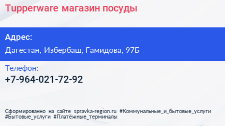 Tupperware, магазин посуды по адресу Дагестан, Избербаш, Гамидова, 97Б в дальнейшем Организация, размещена в следующих категориях: