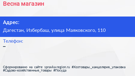 Весна, магазин по адресу Дагестан, Избербаш, улица Маяковского, 110 в дальнейшем Организация, размещена в следующих категориях: