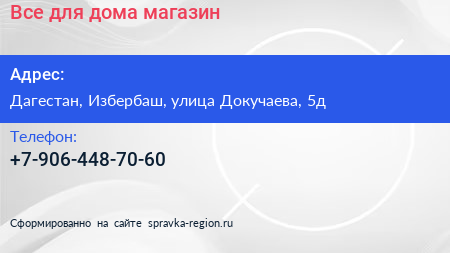 Все для дома, магазин по адресу Дагестан, Избербаш, улица Докучаева, 5д в дальнейшем Организация, размещена в следующих категориях: