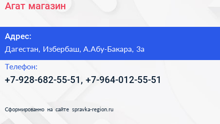 Агат, магазин по адресу Дагестан, Избербаш, А.Абу-Бакара, 3а в дальнейшем Организация, размещена в следующих категориях: