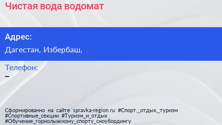 Чистая вода, водомат по адресу Дагестан, Избербаш, в дальнейшем Организация, размещена в следующих категориях: