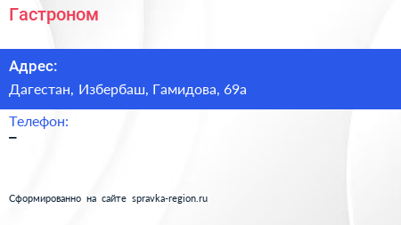 Гастроном по адресу Дагестан, Избербаш, Гамидова, 69а в дальнейшем Организация, размещена в следующих категориях: