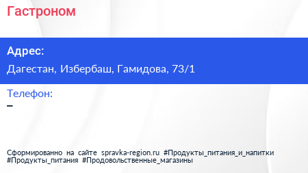 Гастроном по адресу Дагестан, Избербаш, Гамидова, 73/1 в дальнейшем Организация, размещена в следующих категориях: