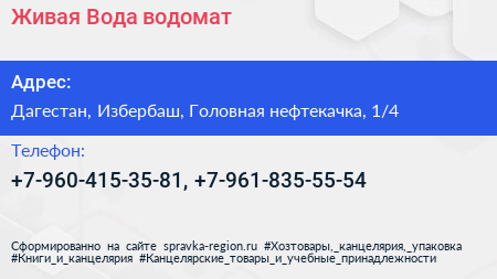 Живая Вода, водомат по адресу Дагестан, Избербаш, Головная нефтекачка, 1/4 в дальнейшем Организация, размещена в следующих категориях: