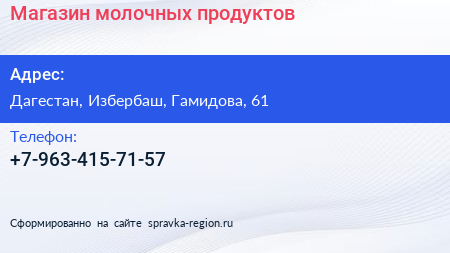 Магазин молочных продуктов по адресу Дагестан, Избербаш, Гамидова, 61 в дальнейшем Организация, размещена в следующих категориях: