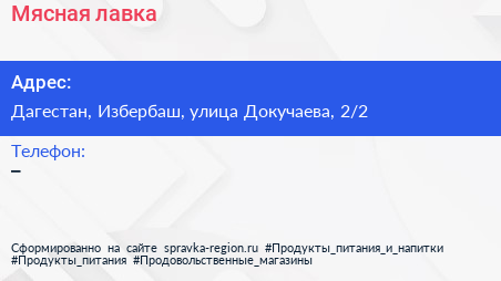 Мясная лавка по адресу Дагестан, Избербаш, улица Докучаева, 2/2 в дальнейшем Организация, размещена в следующих категориях: