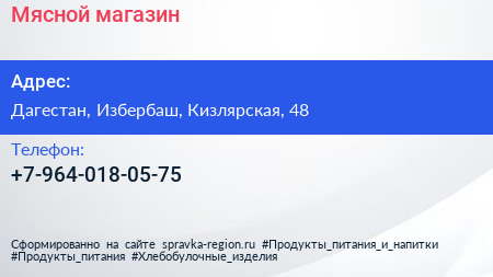 Мясной магазин по адресу Дагестан, Избербаш, Кизлярская, 48 в дальнейшем Организация, размещена в следующих категориях: