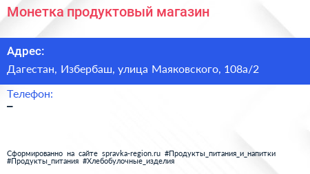 Монетка, продуктовый магазин по адресу Дагестан, Избербаш, улица Маяковского, 108а/2 в дальнейшем Организация, размещена в следующих категориях: