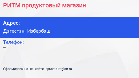 РИТМ, продуктовый магазин по адресу Дагестан, Избербаш, в дальнейшем Организация, размещена в следующих категориях: