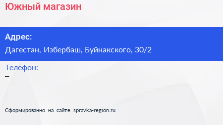 Южный, магазин по адресу Дагестан, Избербаш, Буйнакского, 30/2 в дальнейшем Организация, размещена в следующих категориях: