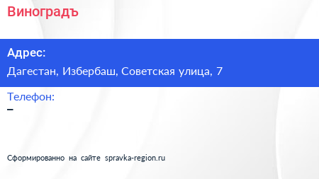 Виноградъ по адресу Дагестан, Избербаш, Советская улица, 7 в дальнейшем Организация, размещена в следующих категориях: